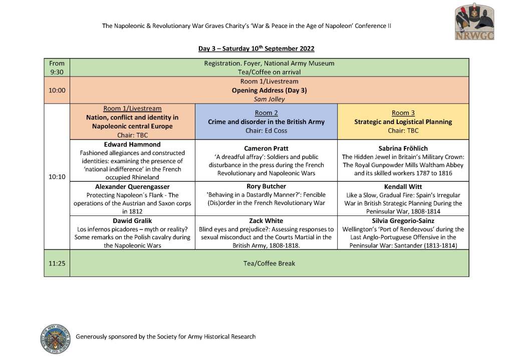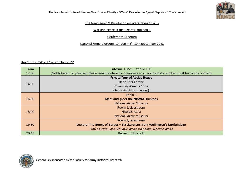 The second ‘War and Peace in the Age of Napoleon Conference’ aims to build upon the rich recent research, with a 2.5 day international ‘hybrid’ conference (both ‘in person’ and online). Returning after the huge success of the first event in 2019, the conference will be run by the ‘Napoleonic & Revolutionary War Graves Charity’ and held at the National Army Museum, London, from the 8th to 10th September 2022. The event has been generously sponsored by the Society for Army Historical Research, and the British Commission for Military History.