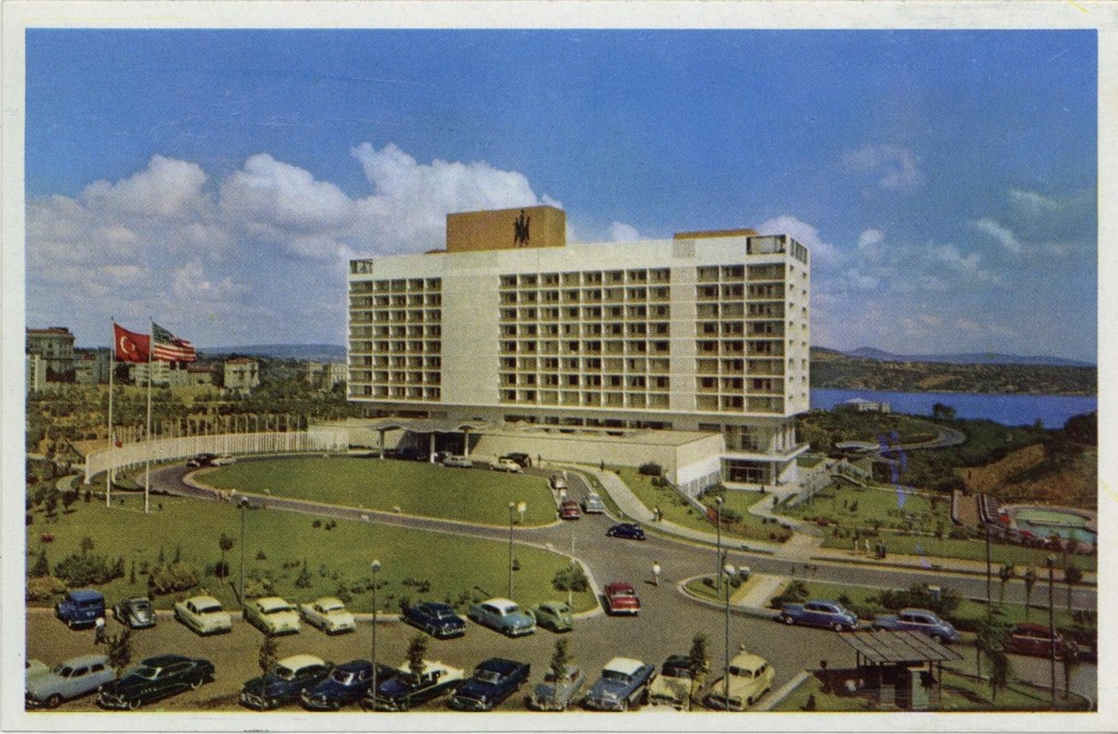 During the 1950s, the Bosporus also became the sight of another form of Cold War politics. Similar to the ways in which foreign powers had established their visual presence with palatial embassy buildings facing the Bosporus, a major US corporation now established an enormous modernist hotel, towering over the hills along the Bosporus. The Hilton Hotel was presented as a landmark of US-Turkish cooperation and a very visible example of US soft power, similar to Hilton hotels in Cairo and Athens established around the same years. Conrad Hilton himself explained the hotel’s rationale: ‘We mean these hotels too as a challenge (…) to the way of life preached by the Communist world’. The hotel thus intended to signify Turkey’s Cold War marriage with ‘westernization’ and capitalism – a white colossus in the Internationalist style for everyone passing through the Bosporus to see.